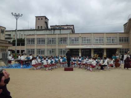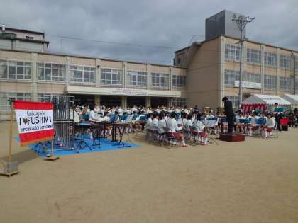 PTA みんなでつくる「親と子の秋のつどい」がはじまりました。PTA会長の挨拶から始まり。伏見中学吹奏楽部の演奏で盛り上がってきました。