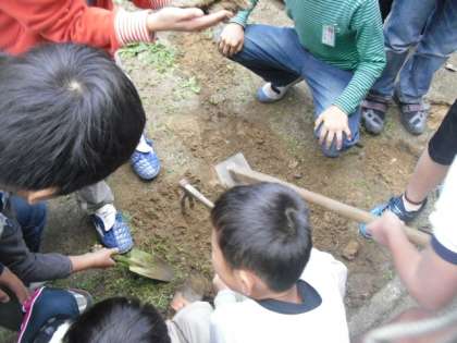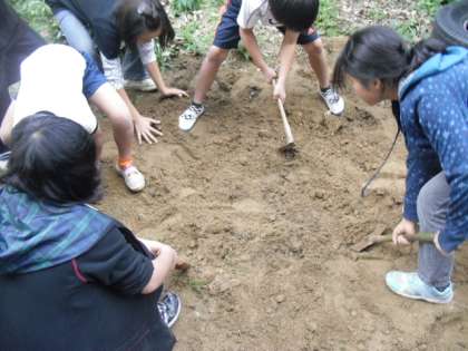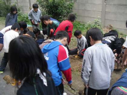 4年生の「きょう土を開く」の学習で、子どもたちは工事の体験のため、みんなで穴を掘ってみました。予想以上の地面の固さと慣れない道具に、子どもたちは昔の工事の大変さを学んでいました。
