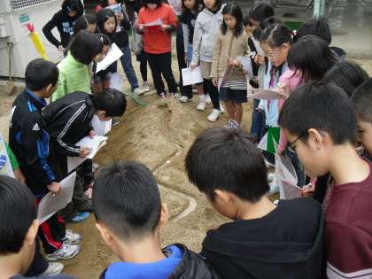 「川に水が流れるとどうなるのか」「水の量が増えるとどうなるのか」を予想してから,実際に砂場で実験して学習しました。川の内側と外側での流れの速さの違いや砂が削れる様子を見た子どもたちはとても驚いていました。
