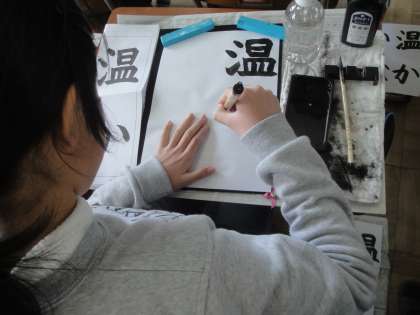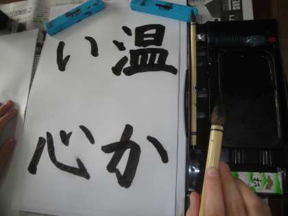 中心や字間,余白に気を付けて『温かい心』を字配りよく書きました。