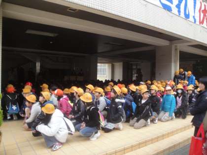 伏見中学校オープンスクールに6年生児童が参加しました。ピロティ前で3校顔合わせをした後,各教室へ向かいました。