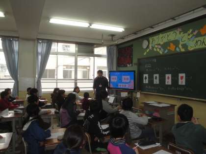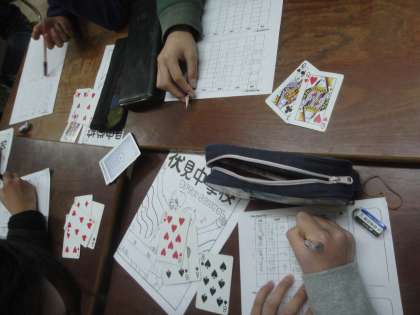 数学の学習の様子です。トランプのゲームを通して,正と負の数の関係について考えました。