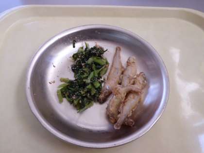 ワカサギの琥珀揚げ 大根葉のごまみそ炒め