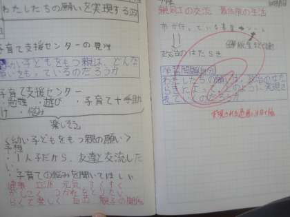 利用者のインタビューや職員の人の話から,幼い子どもをもつ親の願いや施設の役割について気付いたことを話し合いました。