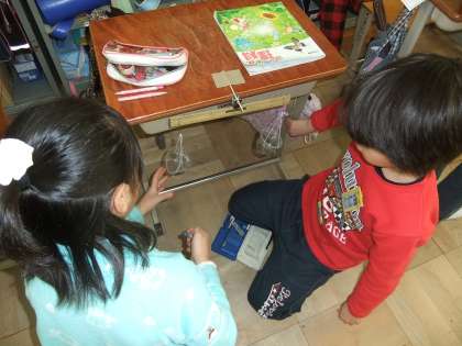 自分たちで天秤を作って重さをはかっています。