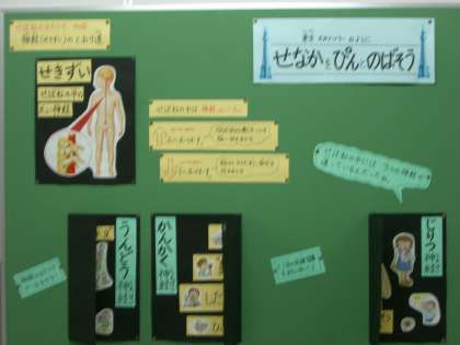 今年もよろしくお願いします。1月の身体計測前の保健指導は「背中をぴんとしよう」の3回目です。11月の2回目に学んだことを保健室前に掲示しました。子どもたちが身につけるようになるためには「繰り返し繰り返し・・・」伝えることが大切です。「11月の話は・・・さんまの背骨の本物を見たなぁ・・・」と思い出して,また新しいことを学んでいってくれたらうれしいと思います。
