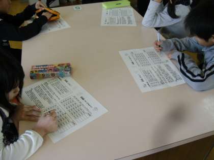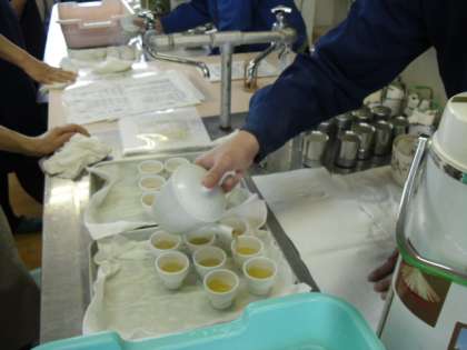 お茶の葉の香りや見た目,手触りなどを学んだ後,いよいよ茶香服伎を体験しました。自分の目や舌を信じ、みんな当てようと頑張っていました。