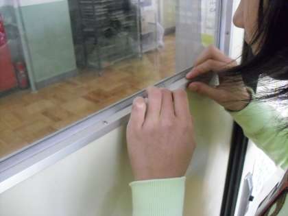 家庭科の学習では,整理整頓や掃除の仕方について学習を進めています。今日は毎日使っている教室の汚れ調べをしました。セロテープを使って様々な場所を調べてみると,目に見えないごみがたくさんあることや,溝や隙間,あまり使っていない場所には汚れが多いことなどがわかりました。