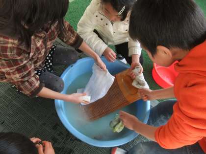 地域の方に正しい使いかたを教えていただいてから,正しい洗濯板の使いかたでもう一度洗濯体験をしました。
