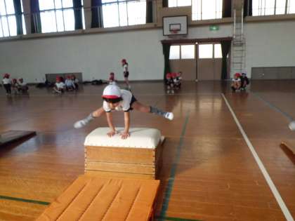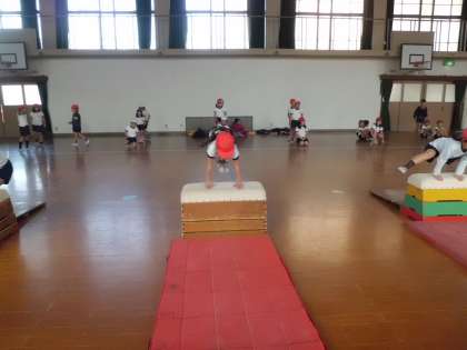 今日から「とびばこあそび」の授業が始まりました。まずは,とびばこ,マット,踏切り板の持ち運び方を知り,場を設定しました。次に,自分がどんな「とびこし方」ができるのか,技調べをしました。