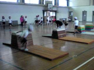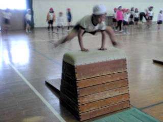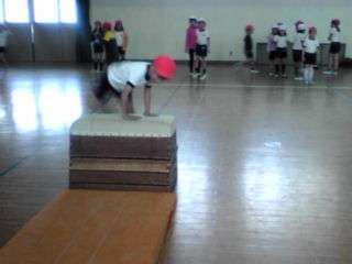 2年生は,とびばこ遊びを楽しんでいます。自分のできる跳びこし方で,高さや向きのちがう跳び箱に挑戦しています。