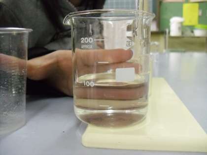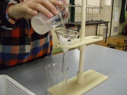 今日の学習では,ホウ酸が溶けた水溶液をろ過する実験を行いました。ろ過されていく様子を,子どもたちは真剣に見つめていました。