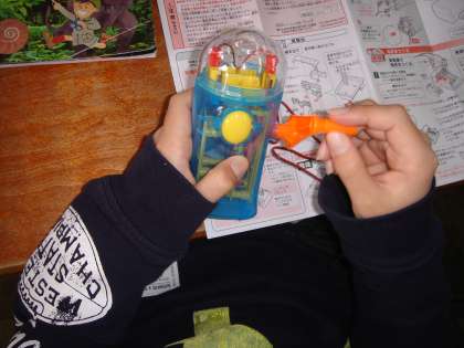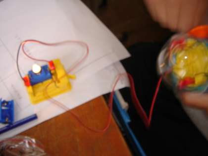手回し発電機で発電した電気を光や音などに変換しました。