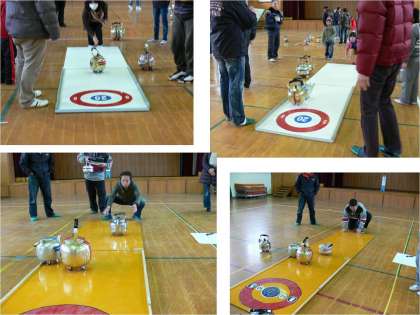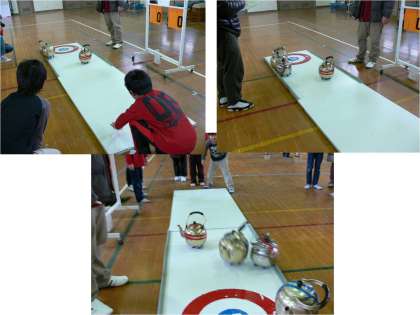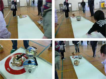ペア同士で対戦し,やかんをリンクに滑らせて相手と得点を競い合うことを楽しむゲームです。子どもも大人も真剣に競い合っていました。