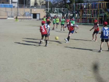 ドリブルやパスをしながら、チームで協力して試合に勝てるように頑張っていました。
