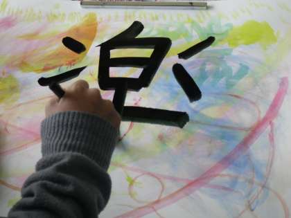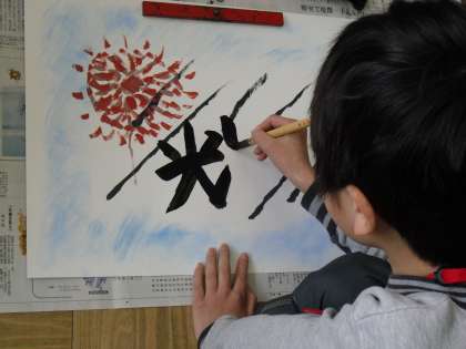4月になり,最高学年となった6年生の子どもたち。思い思いの色や模様で台紙を作り,その上に今年1年にかける思いを漢字一文字で表しました。
