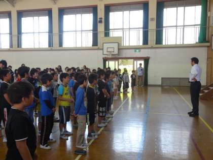 中間休みに,部活動開講式を行いました。バレーボール部・サッカー部・卓球部・相撲部の4つの部活動の指導者の紹介と,活動についての説明がありました。