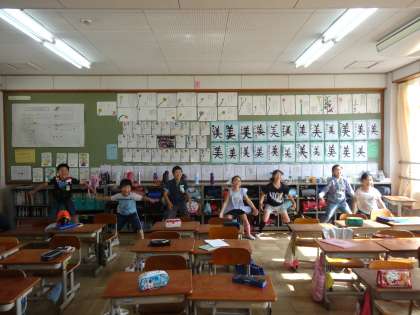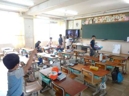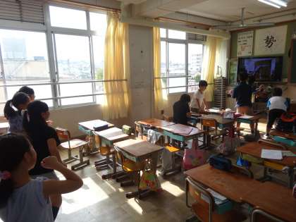 休み時間に,映像を見ながら自主練習する姿が見られます。どの学級も笑顔で楽しく踊れています。