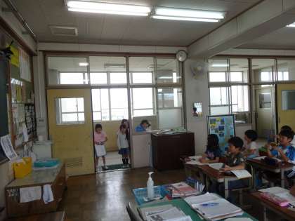 学習中,1年生が学校探検で校舎内を見て回っていました。とても楽しそうに活動できていました。