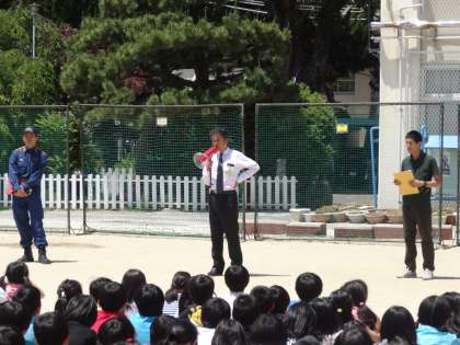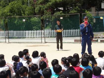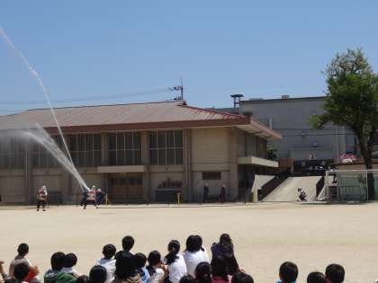 校長先生のお話の後,放水訓練を実際に見せていただきました。