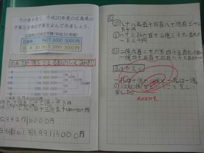 一億や一兆を超える大きな数の位取りを知り,それらの数について読んだり書いたりするとともに,大きな数の構成について理解しました。