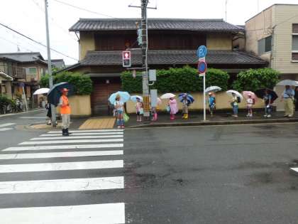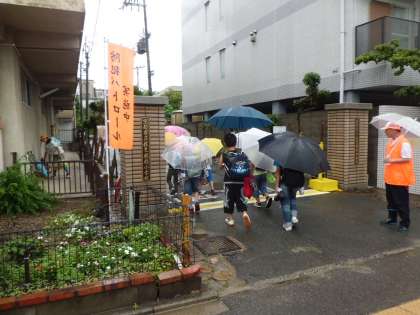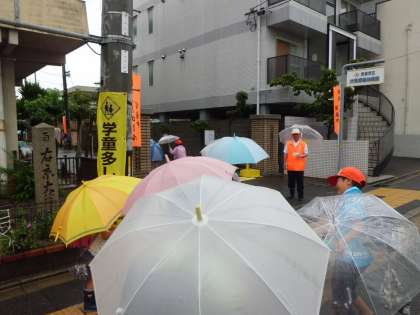 久しぶりの大雨です。傘をさしての集団登校は大変です。