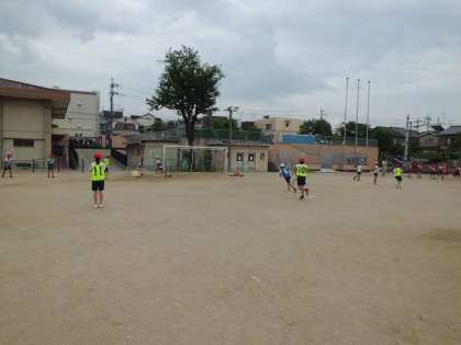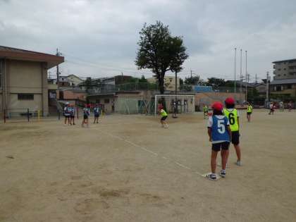 体育科では野球型の「ハンドベースボール」の学習をしています。バットで打つのは難しいので,手打ちで行っています。