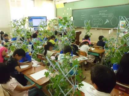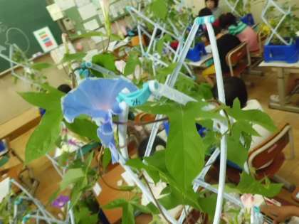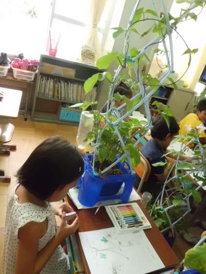 アサガオの鉢を教室に持ってきて,観察日記を書きました。毎日咲く花を楽しみに水やりに精を出しています。