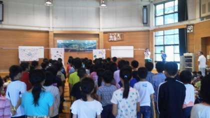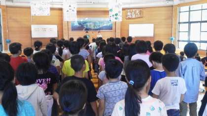これから一緒に過ごす向島南小学校と二の丸北小学校、そして,板橋小学校との合同朝の集いです。