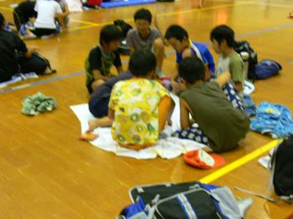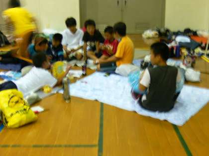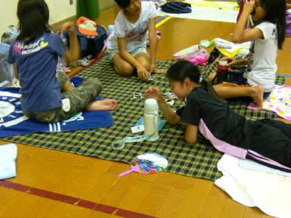 就寝前の自由時間です。体育館の夜を友だちと楽しんでいます。