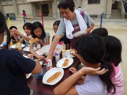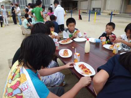 朝食が始まりました。パンに卵,ウィンナー,野菜をはさんで食べます。もりもりと食べる子もいますが,睡眠不足であまり食べられない児童もいました。