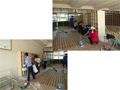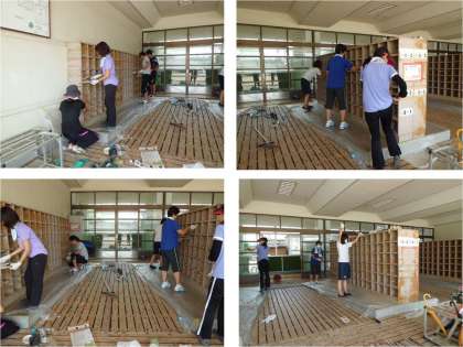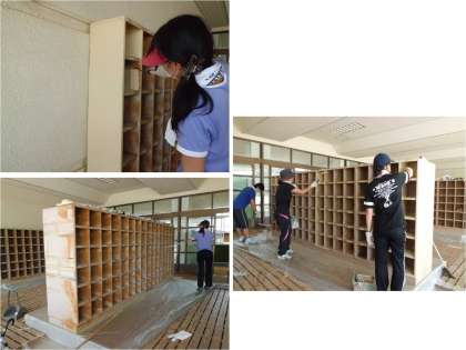 昇降口の靴箱のペンキの塗り替えをしています。