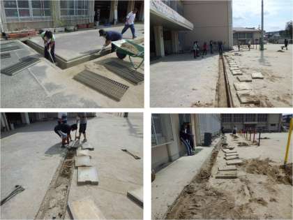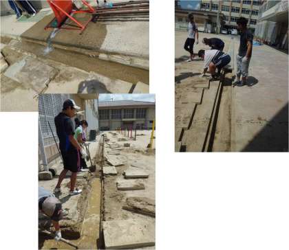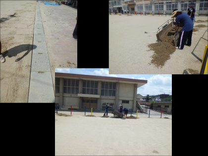 運動場北側の溝にたまった泥をかき出しています。