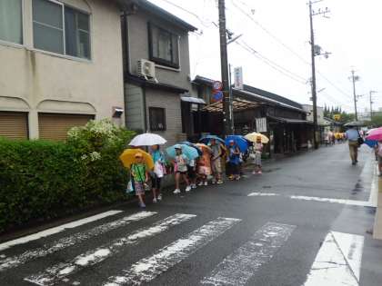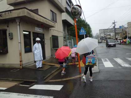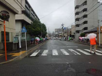 子どもたちの登校する時間帯に大変強い雨が降っていました。傘をさしながら1列で登校します。