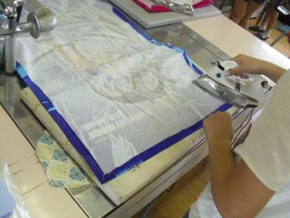 エプロン作りに取り組んでいます。アイロンを使っての三つ折り,しつけ縫い,ミシン縫いなど様々な工程がありますが,一つ一つの作業を大切に,Myエプロンを作っています。完成が楽しみですね。