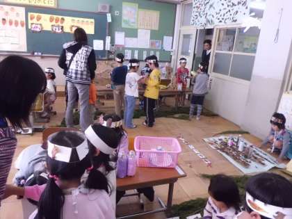 秋見つけで集めた材料を使って,わ投げ・剣玉・宝探し・射的・くじ引・レストランなどを作りました。