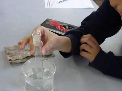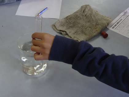試験管の口に石けん水のまくをつけてから試験管を湯の中に入れたり手で握ったりして,石けんまくの変化を調べました。