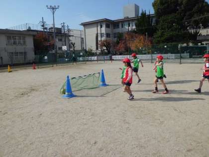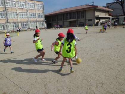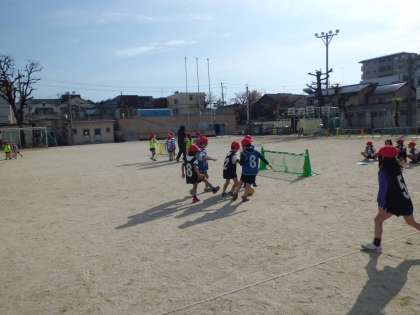 まだ,ルールもはっきり理解できていない状態ですが,自分たちでコートを作り,ゲームを進めています。