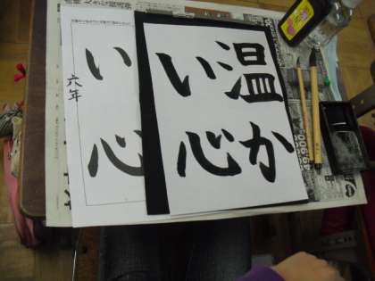 点画のつながりに気を付けて「温かい心」を書きました。4文字のバランスが取りにくかったのですが,お手本をよく見て書きました。