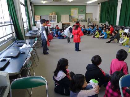 いよいよ学芸会練習も大詰めです。立ち位置やせりふに注意して練習しました。