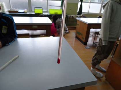 教室の暖房をつけ,棒温度計で教室のいろいろな場所の温度を測って,空気の温まる様子を調べました。