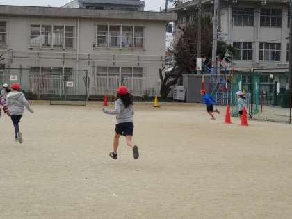 京都サンガの専任コーチにお越しいただき,体づくりや仲間づくりを目的とした指導をしてもらいました。まずは,サッカーゴールに見立てたコーンを駆け抜け,ウォーミングアップをしました。