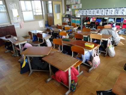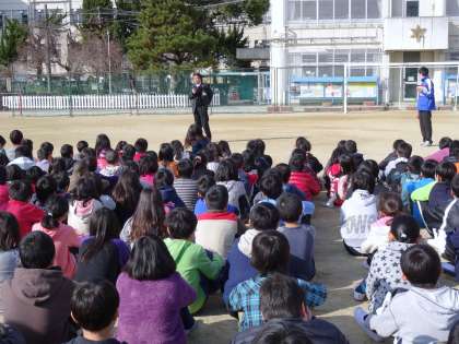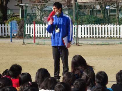 地震の避難訓練をしました。緊急地震速報の合図で,一次避難をしました。避難経路の確認の後,運動場に集合してふり返りをしました。