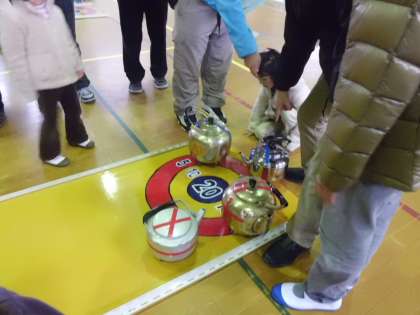 専用のレーン野上にやかんを転がしてリンクの上の得点で勝負を競います。