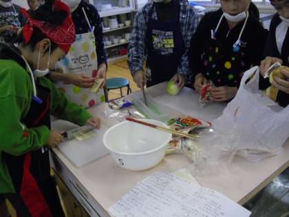 小学校生活最後の調理実習は,栄養バランスや組み合わせなどを考慮しながら献立を考えること,買い物をすること,作ることなど,すべてグループのメンバーで協力して行いました。