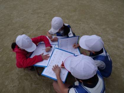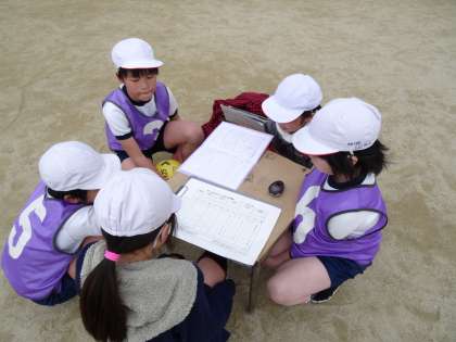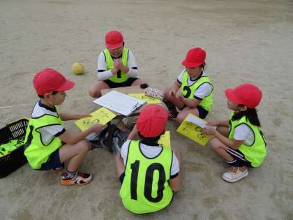 グループでふり返りをしています。次回の作戦の参考にするために,協力して話し合っています。