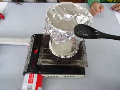 アルミニウム箔にあけた穴の近くに薬さじを近づけて,調べました。