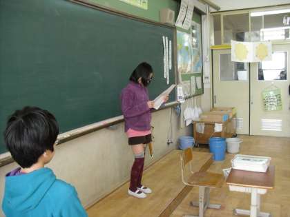 日直さんが気になるニュースをクラスのみんなに伝えています。