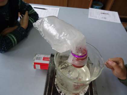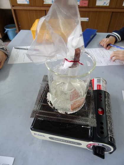 水蒸気を袋に集め,温度が下がると水に戻るか確かめました。