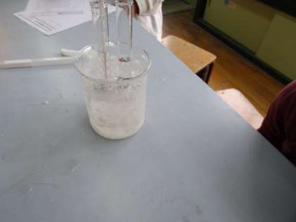 水を冷やし続けたときの,水の様子と温度の変化を調べる。また,水が氷になるときの体積の変化を調べました。